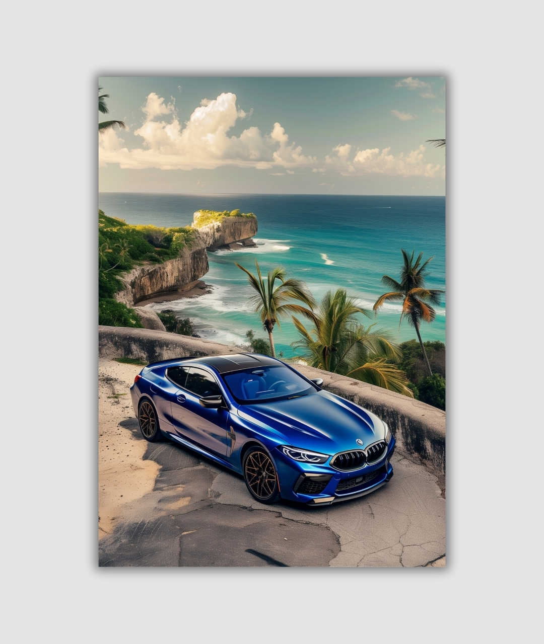 This A4 metal poster places a deep blue BMW M8 Competition above a sweeping ocean horizon. Designed for high-impact color and clarity.