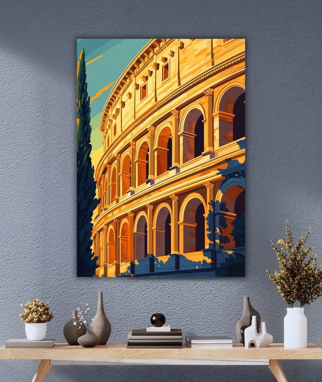 This A4 metal poster highlights the Colosseum’s weathered arches glowing at golden hour. Minimalist vector styling balances terracotta, gold, and blue tones.