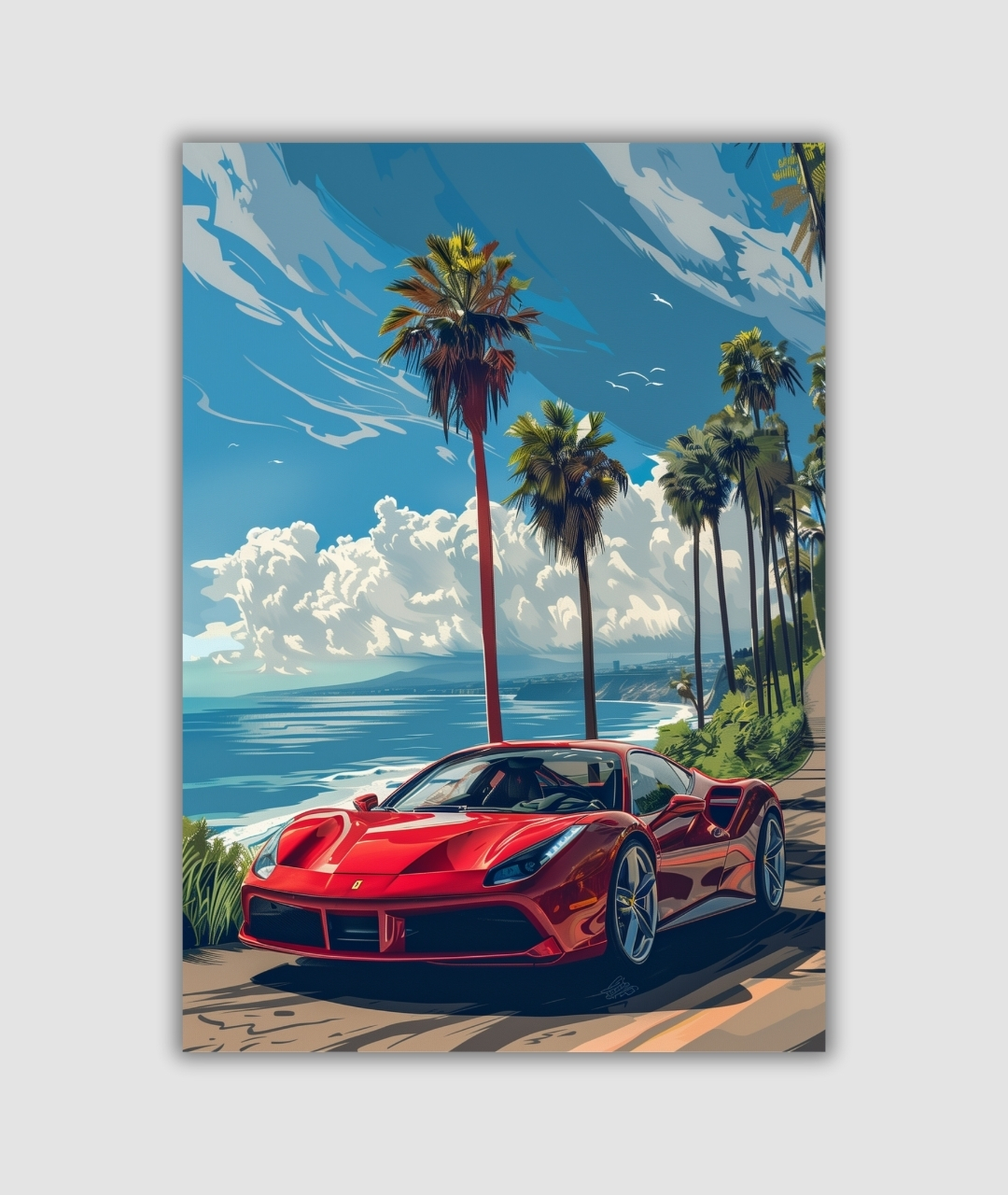 This A4 metal poster features a bright red Ferrari 488 on a cliffside road above the ocean. Crafted for vector-sharp impact.