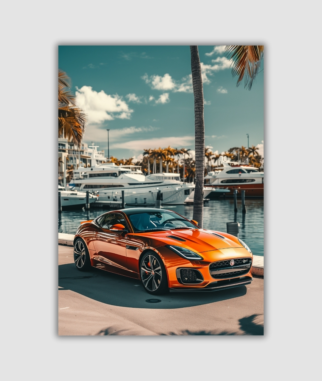 This A4 metal poster places a metallic orange Jaguar F-Type R near a tropical harbor. Designed to deliver color depth and coastal elegance.