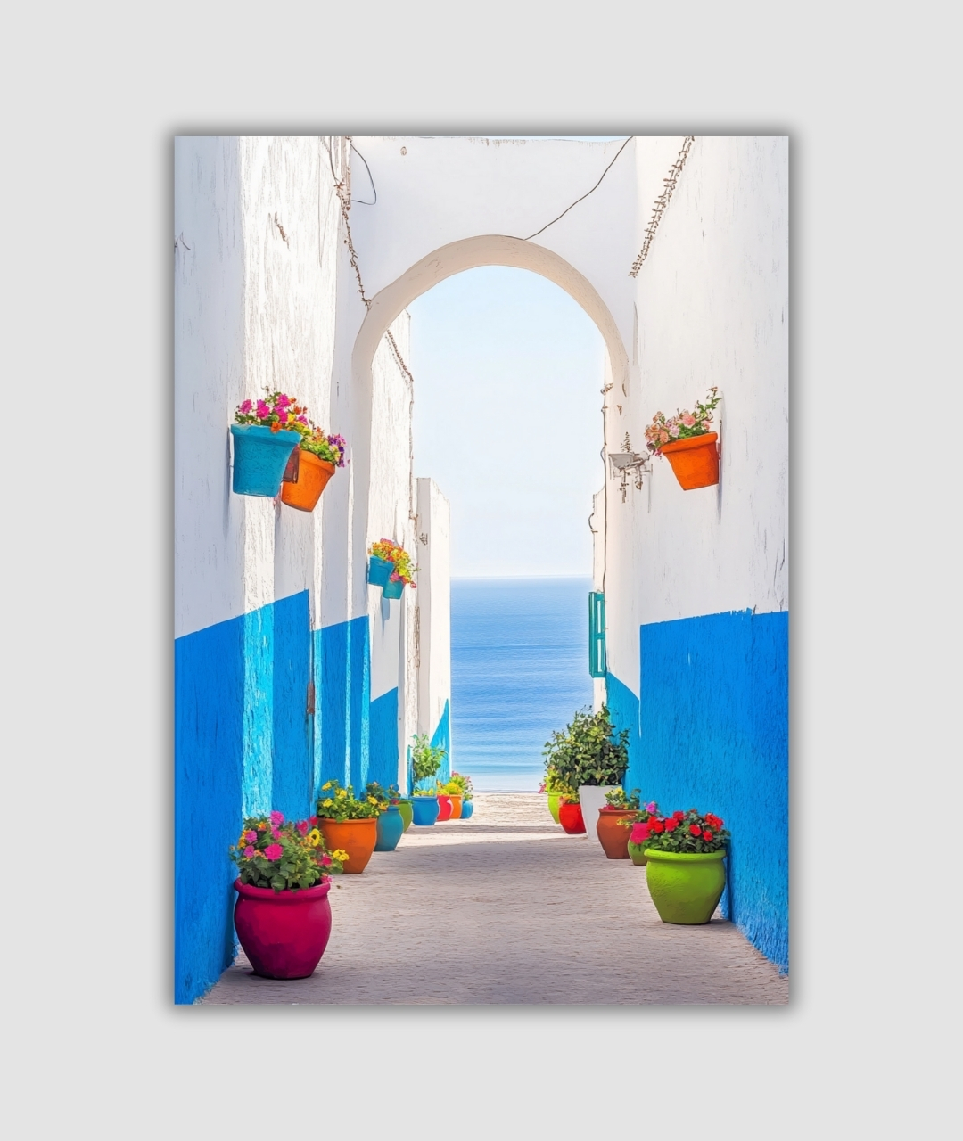 This A4 metal poster shows a clean street in the Kasbah of the Udayas with an arch opening to the sea. Bright, airy vector treatment.
