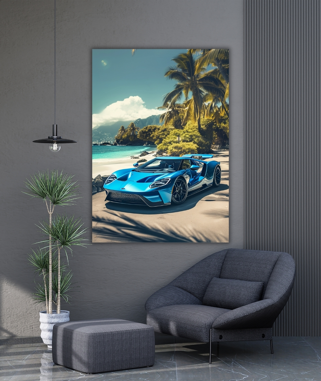 This A4 metal poster features a bright yellow Maserati MC20 overlooking a tropical ocean. A travel-poster composition designed for maximum impact.