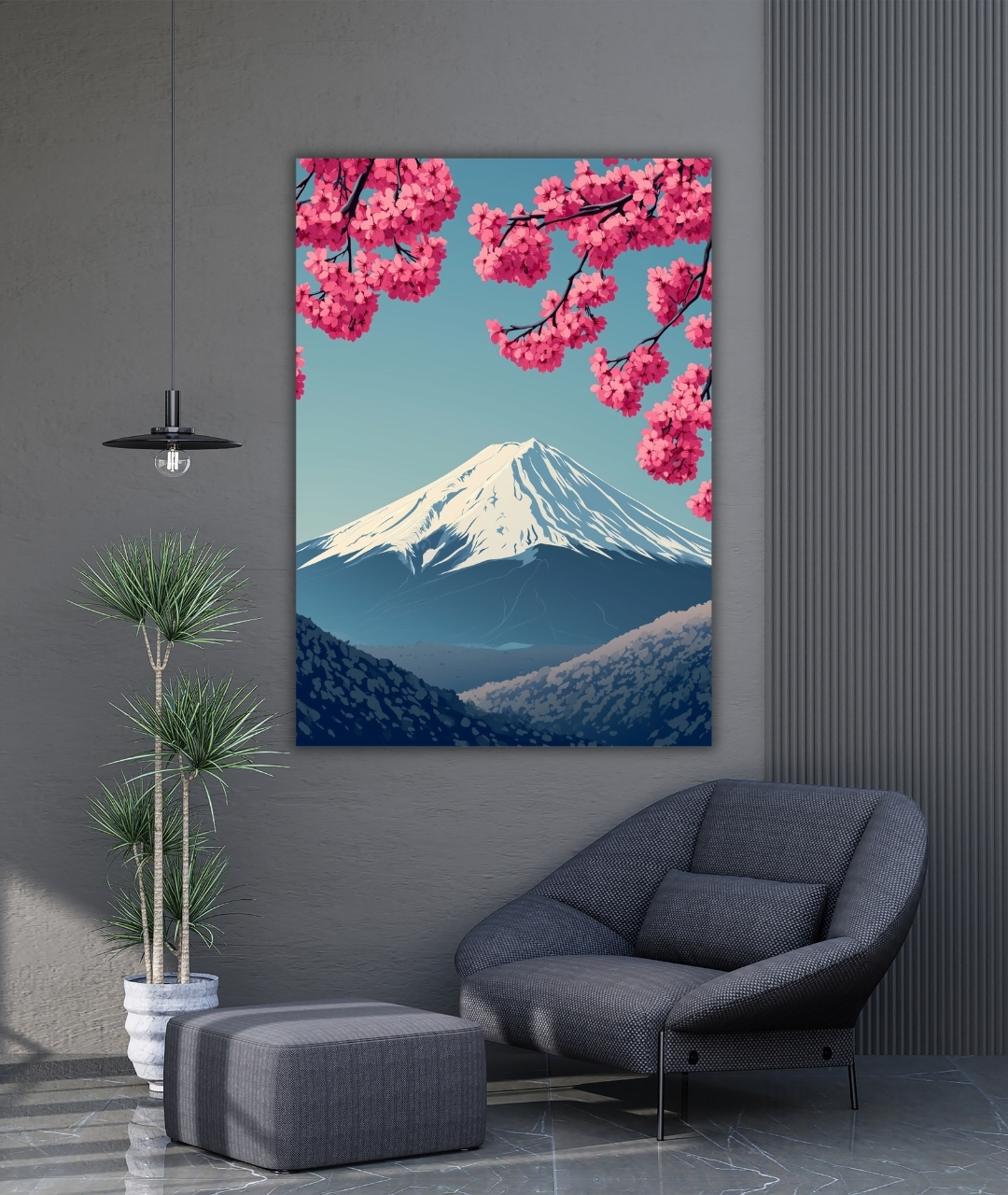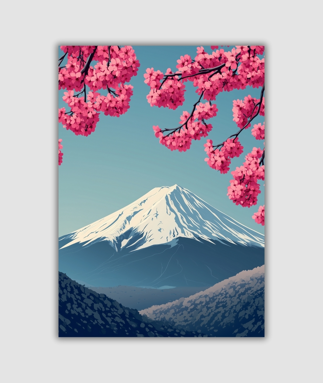 - Iconic Composition: Sakura branch and snowcapped cone.