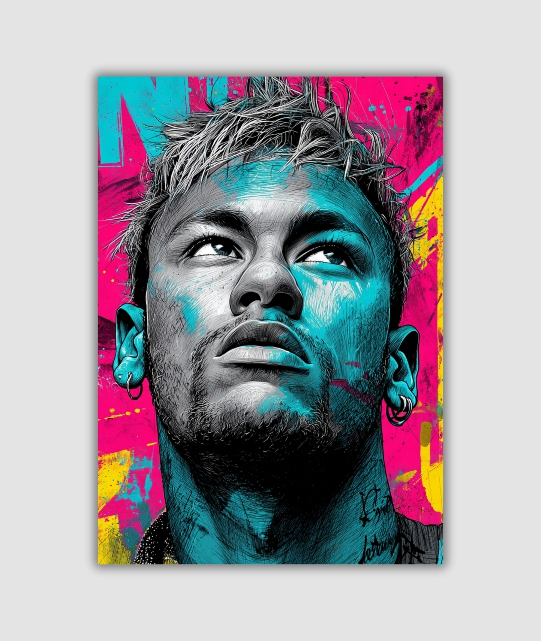 This A4 metal poster captures Neymar in a vivid street-art treatment with comic pop details. Built to impress in gaming rooms, offices, or studios.