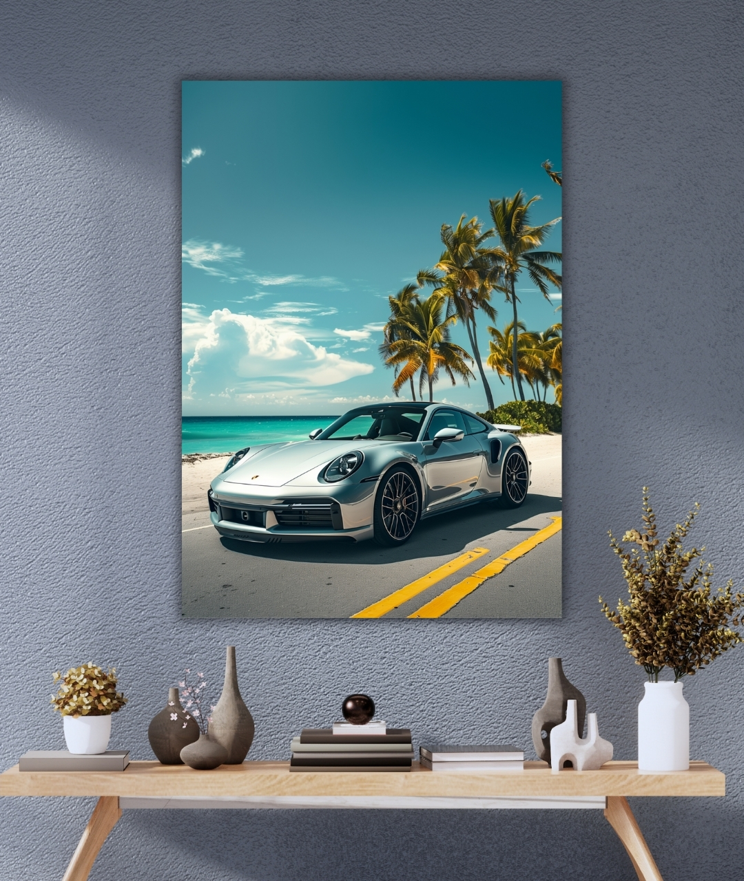 This A4 metal poster shows a silver Porsche 911 Turbo S from the front on a tropical highway. Designed for clean lines and visual punch.