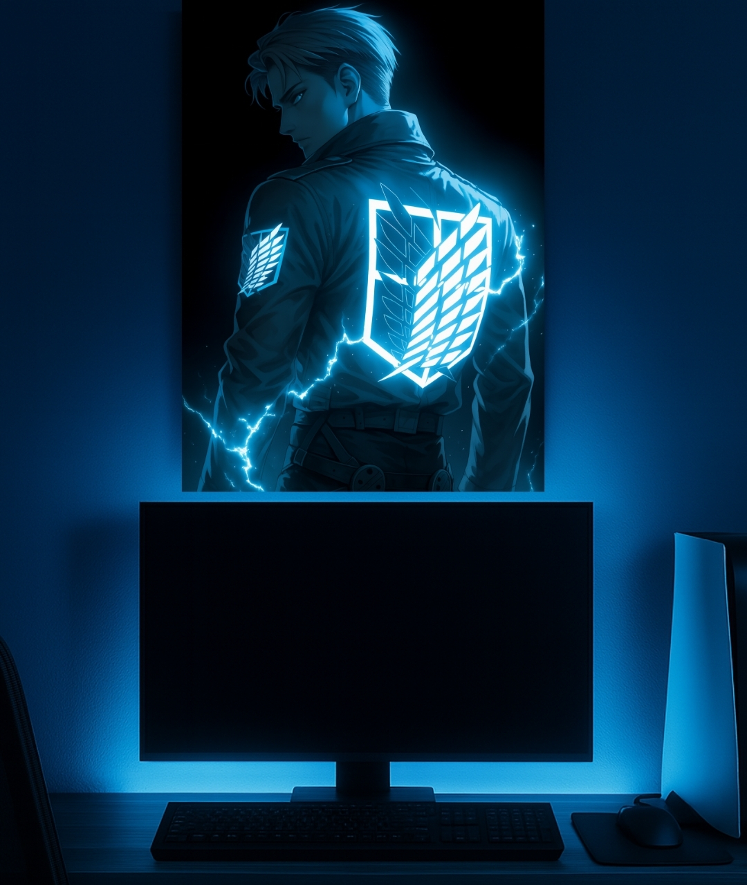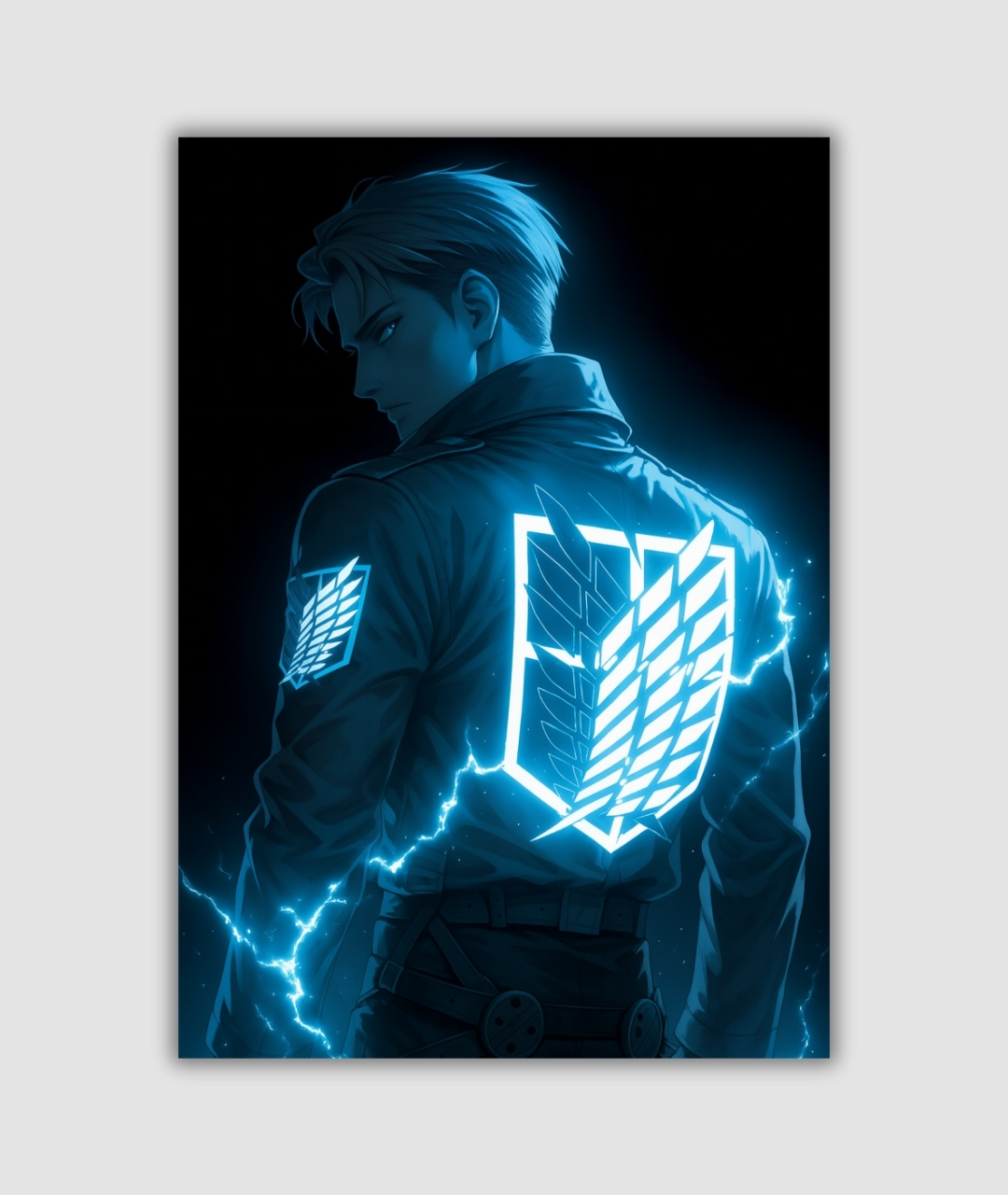 Dedicate your heart to humanity’s cause with this powerful A4 metal poster featuring the iconic Wings of Freedom emblem from Attack on Titan. This artwork portrays a member of the Survey Corps ready for battle, with the symbol of hope and defiance glowing in a brilliant blue. The crackling lightning effects add a sense of dynamic action and urgency to the scene. This is an essential piece for Attack on Titan lovers and a symbol of bravery for any wall.