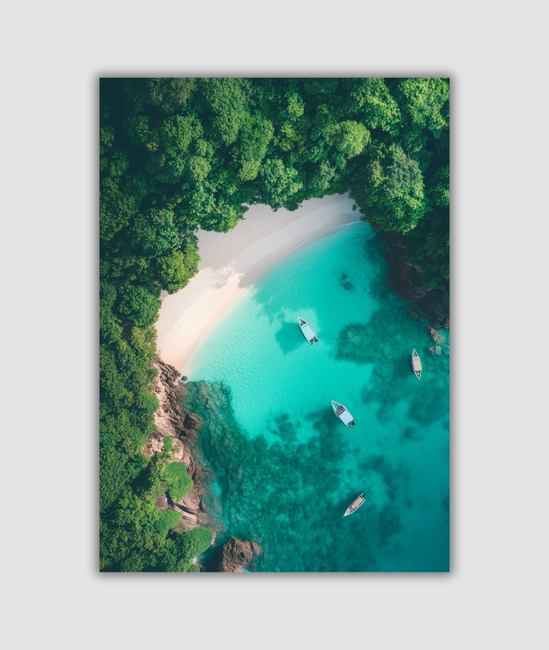 This A4 metal poster offers an aerial view of a tropical island with boats on crystal water. A bold travel-poster palette maximizes contrast.